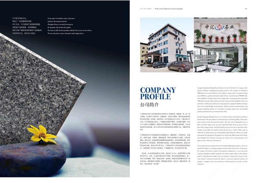 鐘山縣中匯石業(yè)有限責任公司坐落于廣西壯族自治區(qū)賀州市,地處湘、粵、桂三省交界地。公司創(chuàng)立于2019年,占地面積80余畝。企業(yè)實力雄厚,擁有300畝花崗巖礦區(qū)的開采權(quán),礦質(zhì)好、成材率高,年開采荒料10萬立方米,大板150萬平方米,年產(chǎn)值高達億元,產(chǎn)量穩(wěn)定實現(xiàn)連年增長。公司才能兼?zhèn)?,自有生產(chǎn)車間,加工設(shè)備精良。配備有紅外線橋切機、紅外線自動切邊機、全自動磨光機、定厚機、仿形機、雕刻機等先進設(shè)備,致力于將天然石材塑造成形態(tài)美觀的產(chǎn)品,奉獻給社會各界用戶。