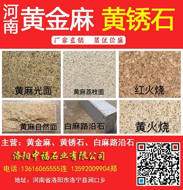 洛陽中福石業(yè)(電話:13616065555連17036286666連13592009904鄭)是河南黃金麻、河南黃銹石、河南白麻、河南芝麻白、角美銹、龍海銹、漳浦銹、g682石材、g682花崗巖、黃金麻花崗巖、黃金麻石材、黃色石材、黃色花崗巖、荒料、路沿石、墓碑石、工程面板、異型加工、芝麻黑廠家、花崗巖石材、幕墻石材、干掛板、馬路牙子、水溝蓋板、花圍樹圍、荔枝面、火燒面、磨光面花崗巖板材等產(chǎn)品專業(yè)生產(chǎn)加工的工廠,擁有完整、科學(xué)的質(zhì)量管理體系。洛陽中福石業(yè)有限公司的誠信、實力和產(chǎn)品質(zhì)量獲得業(yè)界的認(rèn)可。歡迎各界朋友蒞臨參觀、指導(dǎo)和業(yè)務(wù)洽談。河南黃麻光面河南黃麻荔枝面河南紅火燒河南黃麻自然面河南白麻路沿石/道牙石/路緣石/路側(cè)石/鋪路石/路邊石河南黃火燒面河南黃金麻河南黃銹石/河南黃金鉆石材/河南芝麻白/河南白色花崗巖/河南白色石材/河南黃色石材/河南黃色花崗巖