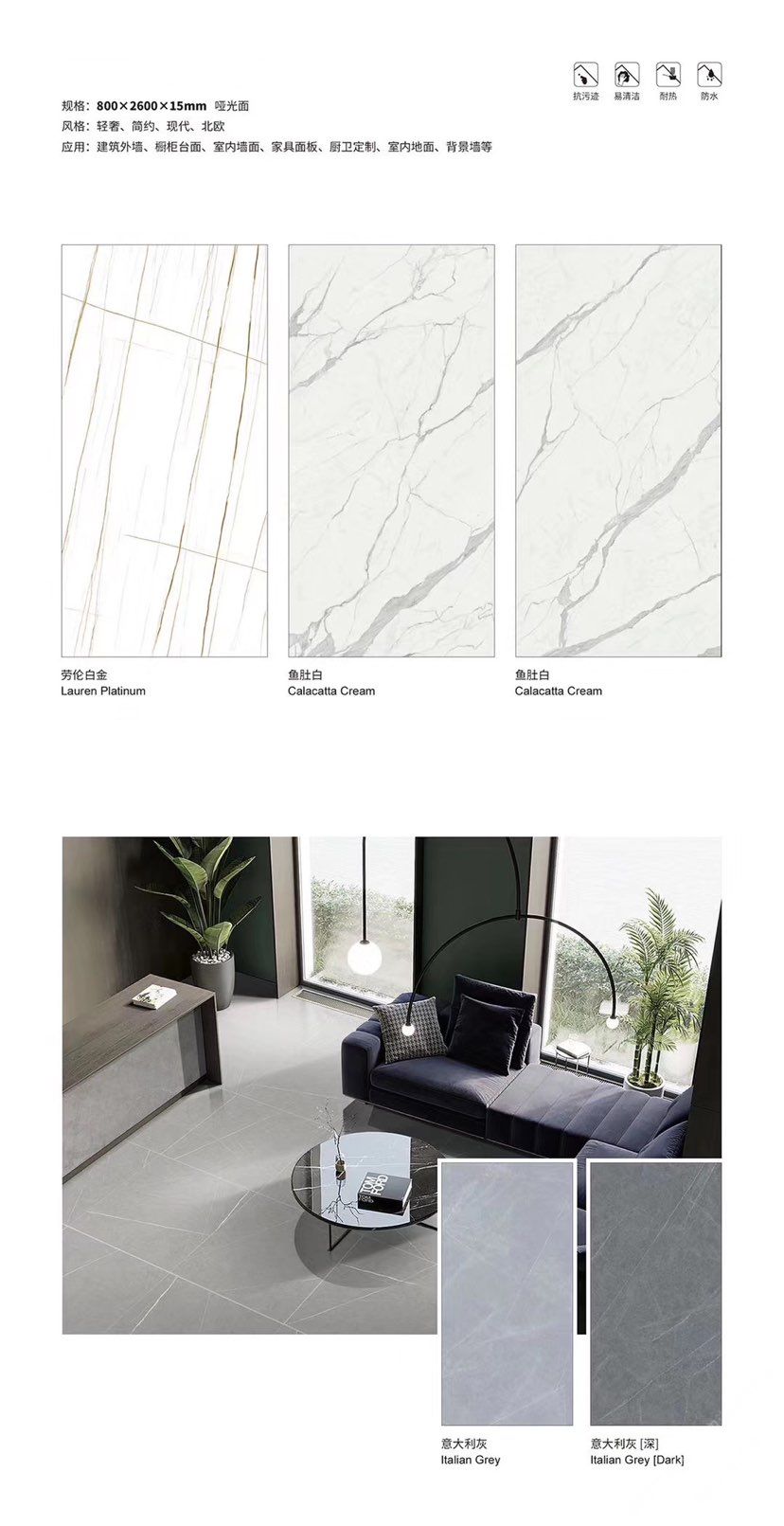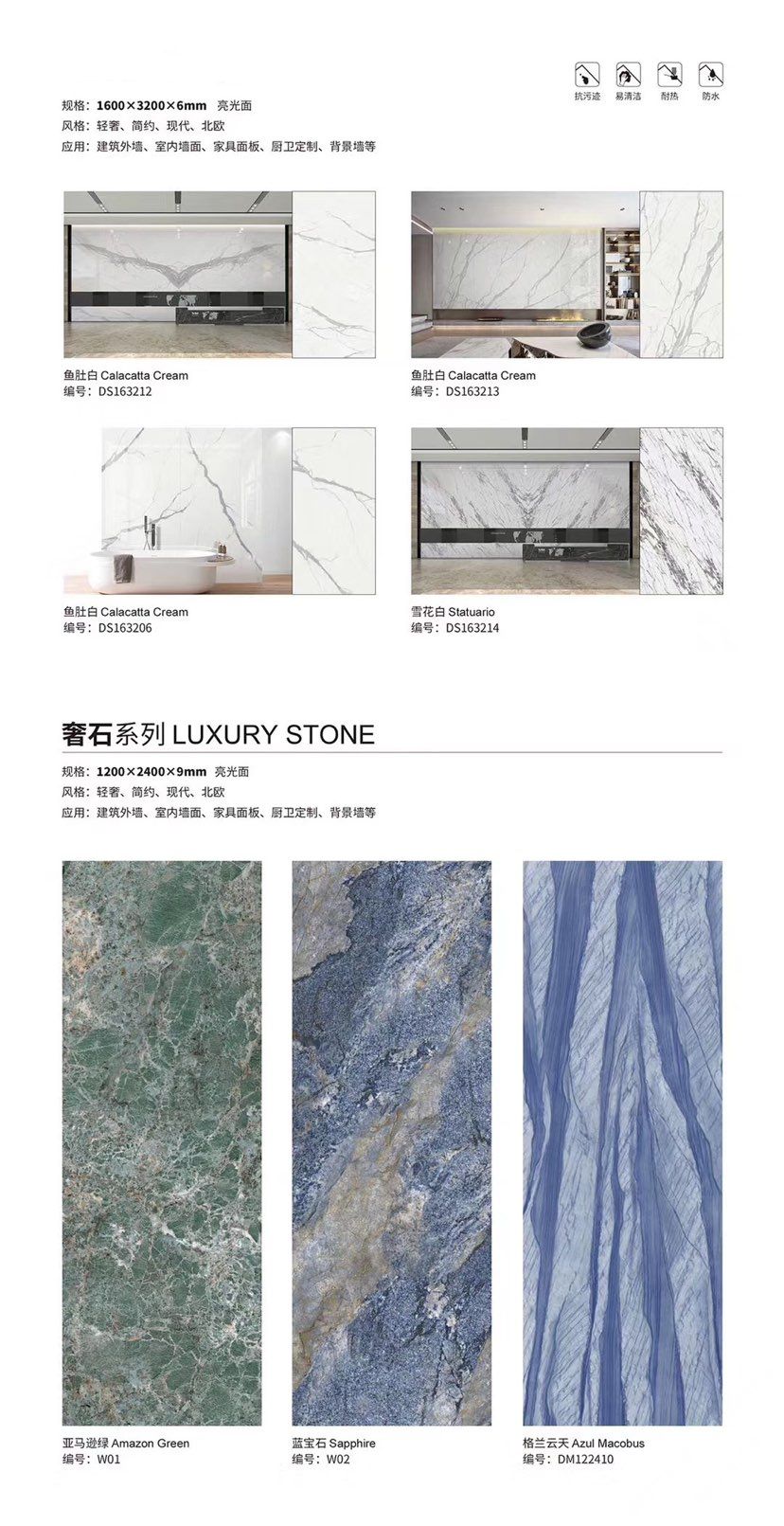 發(fā)布信息: ????SIBELAN 斯貝納巖板???? ????意大利設計師精選巖板???? 我們可以幫老總您加工為成品, 全國范圍內(nèi)可安排專業(yè)團隊安裝. 做到您一次性采購 省心. 放心. 省時. 低價! 巖板紋路版面全多達199 款 勵志做服務五星的巖板專業(yè)供應商 魚肚白 雪花白 格蘭云天 寒江雪 爵士白 幻影灰 勞倫黑金 火山灰 亞馬遜 艾維拉 羅馬黑檀 貝特巖 細花白 羅馬灰 云朵拉灰 魚肚金 莎羅娜 莎羅蘭 勞倫白金 拉薩白 中花白 灰冰玉 卡拉拉白 撒金黑 清水玉 薩瓦灰 莎士比亞 大花灰 白冰玉 銀灰洞 阿瑪尼灰 綠紋玉 綠冰玉 藍紋玉 保加利亞灰 鐵銹 黑木紋 流砂灰 純白 純灰 純黑 TEL: 15905069590 聶 各種版面規(guī)格全部如下: 1200×600×11mm 啞光 1500×800×11mm 啞光 1800×900×11mm 啞光 1800×900×12mm 啞光 2600×800×15mm 啞光 2400×1200×6mm 啞光/亮光 2400×1200×9mm 啞光/亮光 2400×1200×15mm 啞光 2700×1200×6mm 啞光/亮光 2700×1600×12mm 啞光/亮光 3200×1600×6mm 啞光/亮光 3200×1600×12mm 啞光/亮光