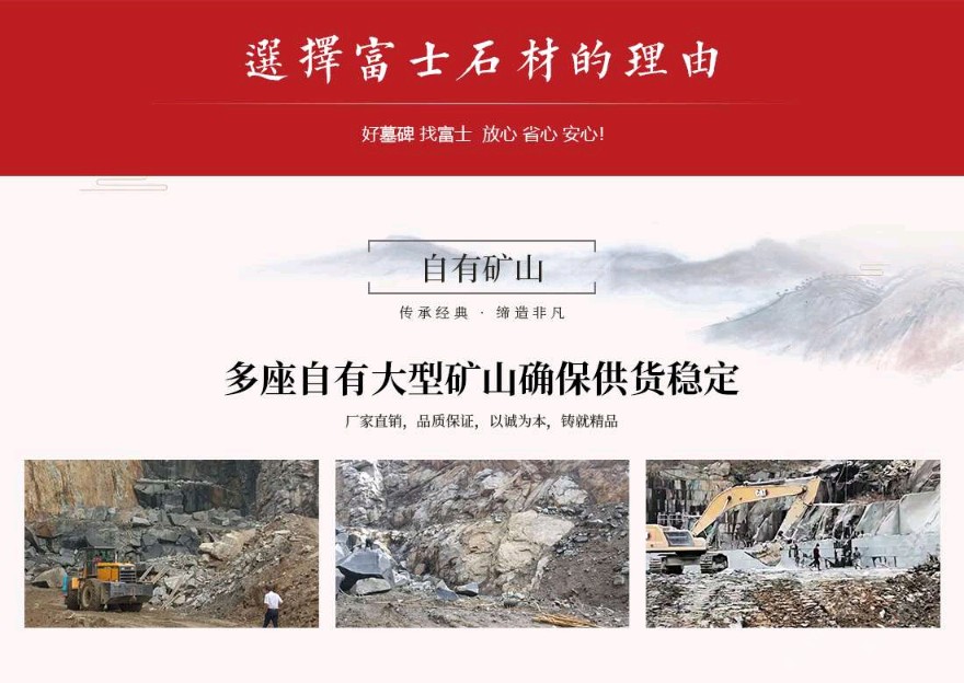 發(fā)布信息: 富士石材位于世界石雕之都——福建惠安,于1996年成立,主營(yíng)墓碑生產(chǎn)、墓碑研發(fā)設(shè)計(jì)、公墓運(yùn)營(yíng)&殯儀館運(yùn)營(yíng)、公墓陵園景觀、規(guī)劃設(shè)計(jì)等一條龍殯葬服務(wù)。公司自成立以來(lái)不斷引進(jìn)當(dāng)今世界先進(jìn)的生產(chǎn)設(shè)備及加工工藝,用專業(yè)的設(shè)備造優(yōu)秀的產(chǎn)品。公司擁有一大批經(jīng)驗(yàn)豐富的技術(shù)型管理人才,以嚴(yán)謹(jǐn)?shù)墓芾硖峁└咝У姆?wù),并配以先進(jìn)的電腦設(shè)計(jì)及現(xiàn)代化企業(yè)管理模式,秉承 “以客戶為中心、以質(zhì)量為根本,以市場(chǎng)為導(dǎo)向、以人文為基礎(chǔ)”的經(jīng)營(yíng)理念,經(jīng)過(guò)將近三十年的發(fā)展,逐步發(fā)展成為一家集墓碑加工生產(chǎn)、研發(fā)設(shè)計(jì)、陵園規(guī)劃設(shè)計(jì)、公墓運(yùn)營(yíng)&殯儀館運(yùn)營(yíng)為一體的公司。