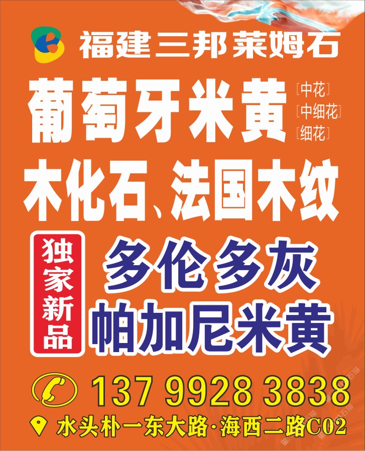 福建三邦石業(yè) 聯(lián)系人:高先生    137****5858 查看 手機(jī)號(hào)碼:無 主營(yíng)范圍: 大板批發(fā)、異型加工、礦山、石材雕刻、石材工藝品、石材工程資質(zhì)企業(yè)、石材交易市場(chǎng)、水刀拼花、 企業(yè)地址:福建泉州樸一工業(yè)區(qū)東大路(直走200米)