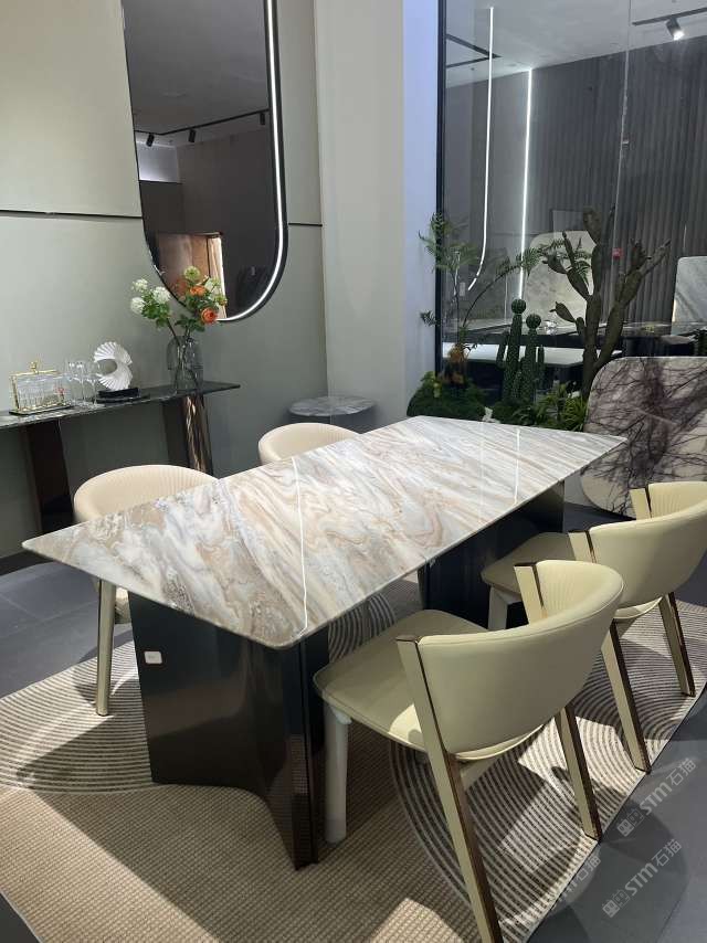實木結(jié)合五金奢石餐桌:雪山銀狐#水頭奢石家居中心