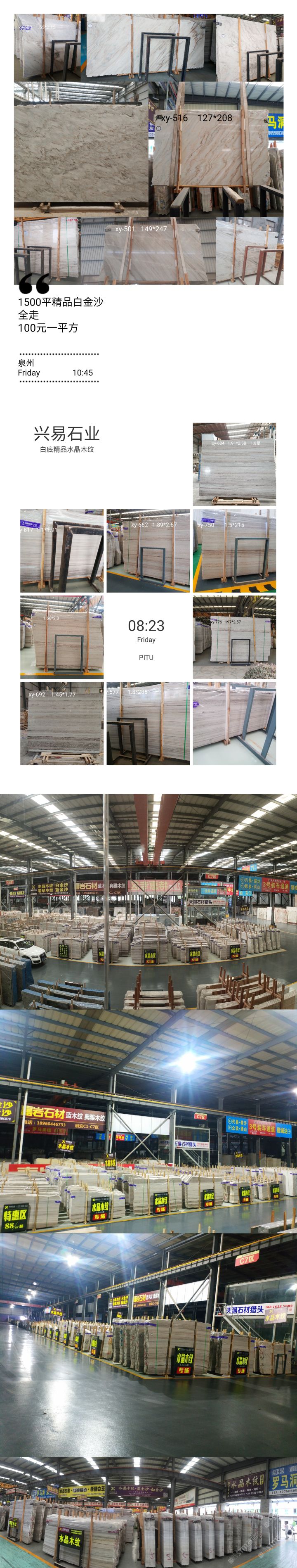 發(fā)布信息: ? ? ? 【興易大理石】 ? ? 白底水晶木紋專場 ? 我司主營水晶木紋系列: 水晶木紋,翡翠木紋,國產(chǎn)藍(lán)金沙,白金沙,彩虹木紋 ? 2萬平精品白底水晶木紋新料任選, 條板,大板 荒料均有售,統(tǒng)一花色,防水背膠供應(yīng)! 500平藍(lán)底水晶木紋全走價優(yōu) 1300平斜紋白金沙全走價優(yōu) 歡迎新老客戶來電垂詢! ? ?地址: ? 濱海高時物流一號館大門旁 ? 創(chuàng)安c區(qū)c7區(qū)興易石材 ? 電話:13514000031小李 ? ?