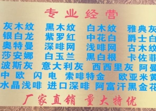 新華宮主營產(chǎn)品:愛馬仕灰5,愛馬仕灰6,愛瑪仕灰(廣東),愛馬仕灰(淺藍(lán)底),愛馬仕灰(新礦),七彩山水畫,白玉蘭,精品山水畫,奧特曼,工藝品擺件,臺(tái)面板(大理石),水刀拼花(玉石)企業(yè)地址:廣東云浮加工場(chǎng)